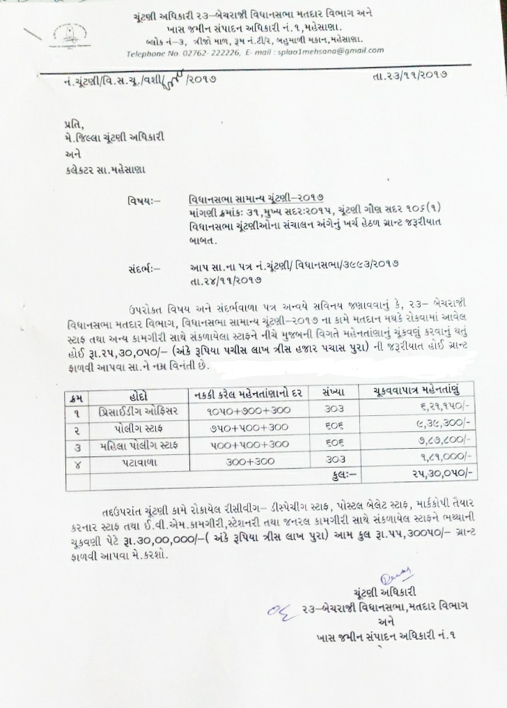 MEHSANA- BECHRAJI CHUNTANI KAMGIRI MA PRESIDING TATHA POLLING STAFF NE MALNAR BHATHTHA BABAT PARIPATRA DATE -23-11-2017.